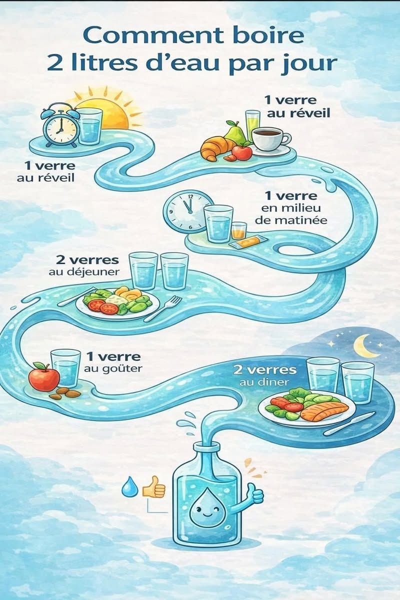 L’image propose une méthode simple : répartir la consommation d’eau tout au long de la journée plutôt que de boire de grandes quantités en une seule fois.