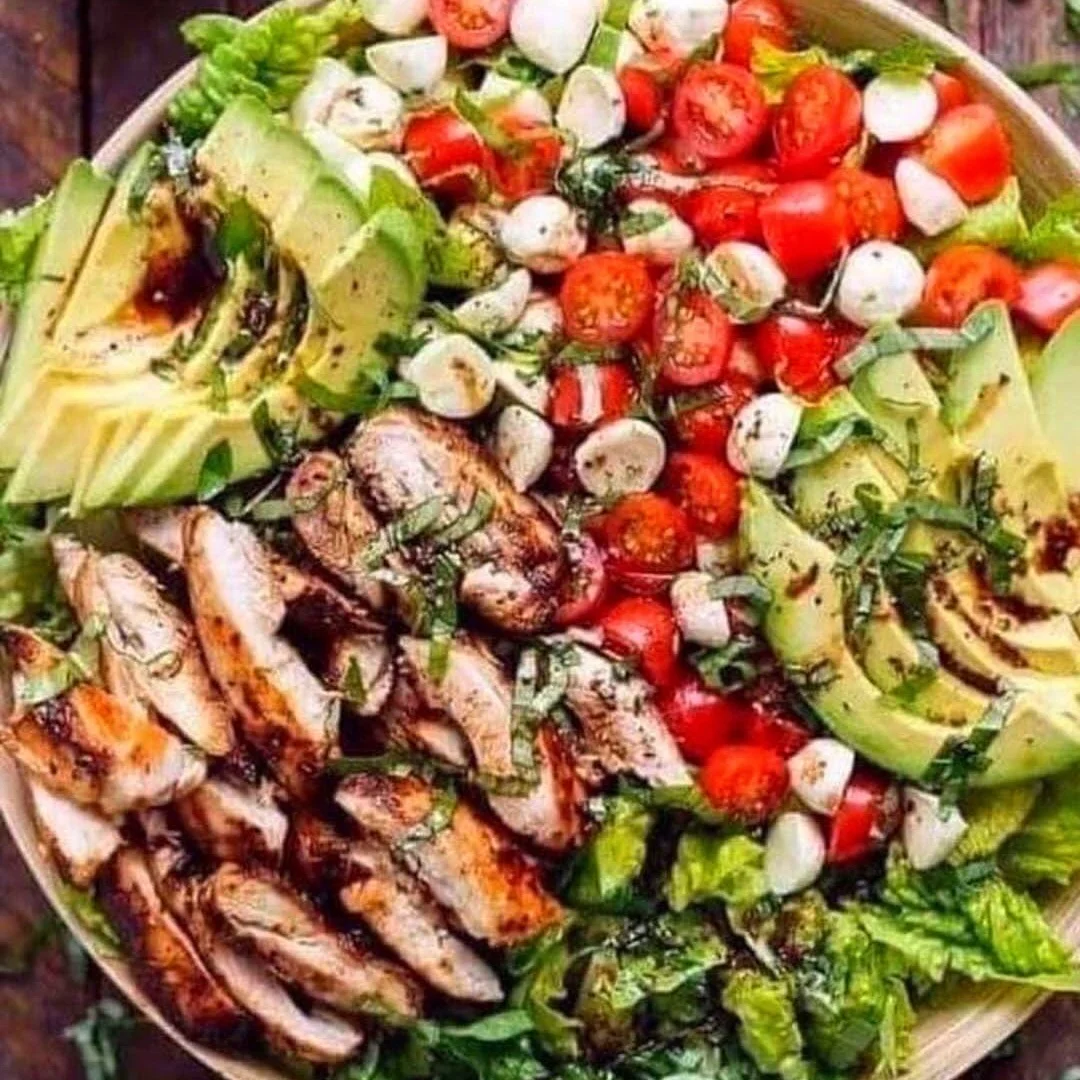 Du poulet tendre, de la mozzarella fondante, des tomates cerises juteuses et de l’avocat crémeux, le tout parfumé au basilic frais et à la vinaigrette balsamique — un repas sain, équilibré et prêt en quelques minutes. 💚