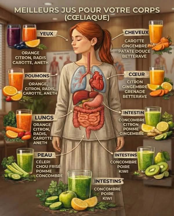 Il est important de prĂ©ciser qu’aucun jus ne “cible” directement un organe, mais certains nutriments contenus dans ces aliments participent au bon fonctionnement global de l’organisme.