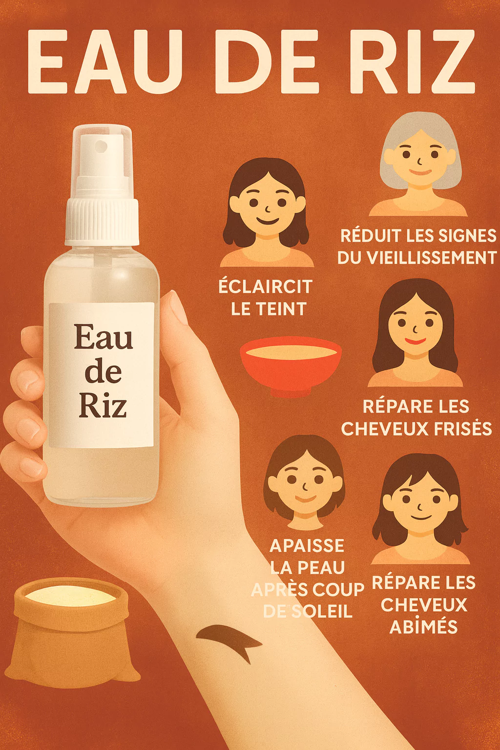 – Éclaircir et unifier le teint : l’amidon présent dans l’eau de riz aide à réduire l’excès de sébum et laisse une peau plus nette.