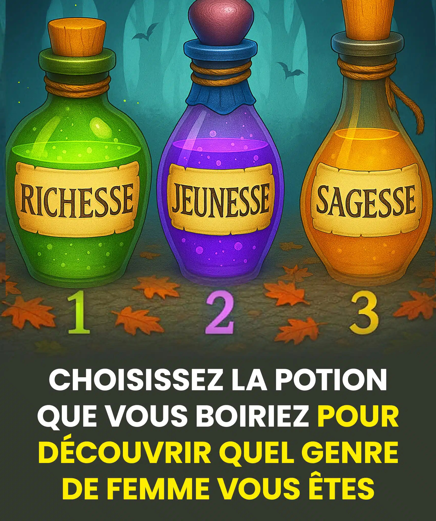 Au cœur d’une clairière mystérieuse, trois élixirs scintillants vous appellent. Votre choix instinctif révélera laquelle de vos facettes féminines domine votre être. Laissez-vous guider par la magie de cette expérience unique.